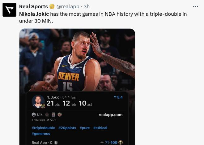 本場對陣鵜鶘隊,約基奇27分鐘三節(jié)打卡拿到21+12+10三雙數(shù)據(jù),開季至今4場比賽完成三雙4連擊神奇表現(xiàn)。