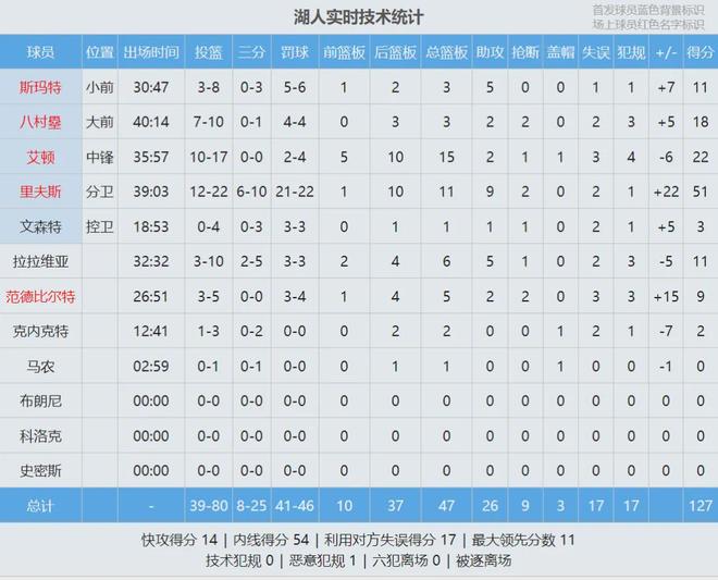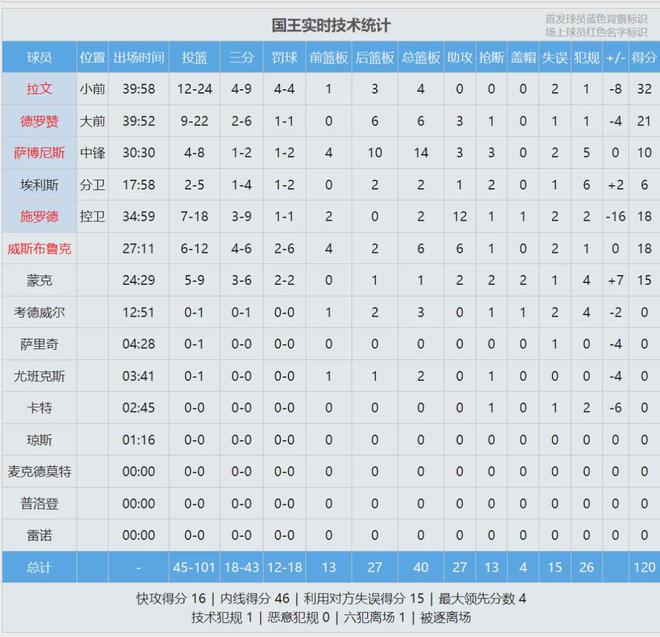 本場比賽,拉文投籃24中12,三分9中4,罰球4中4,得到32分4籃板2失誤,正負(fù)值-8。威少打出了加盟國王之后的最強(qiáng)表現(xiàn):替補(bǔ)出戰(zhàn)27分11秒,投籃12中6,三分6中4,罰球6中2,拿到18分6籃板6助攻1搶斷,正負(fù)值0。